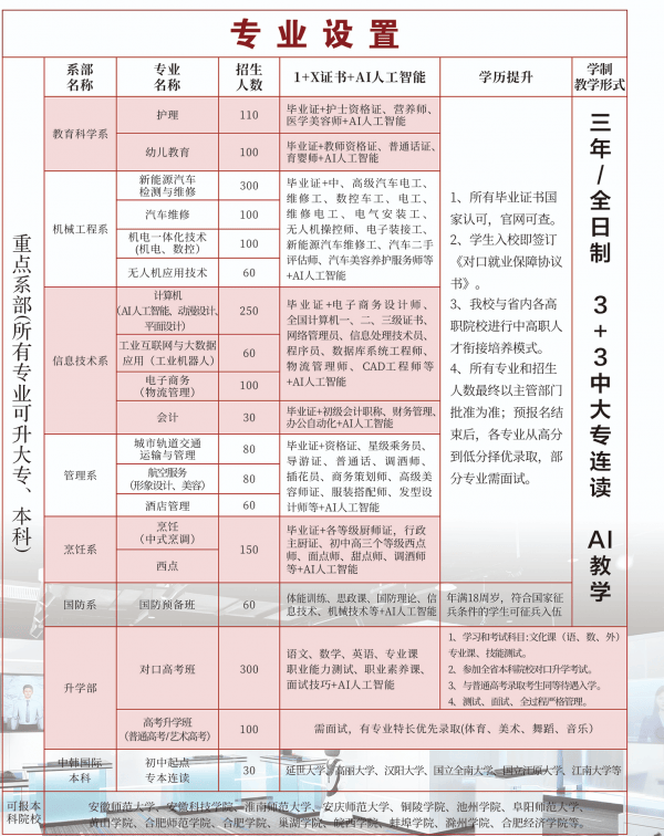 学校取淮南师范学院、合肥职业手艺学院、安庆师范大学等省内多所优良高职院校成立持久不变合做关系,打制优良“3 + 3”中大专连读项目。该模式具有以下劣势!